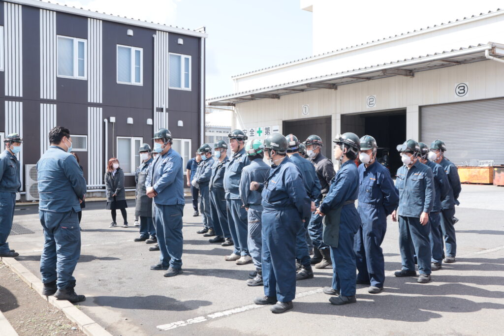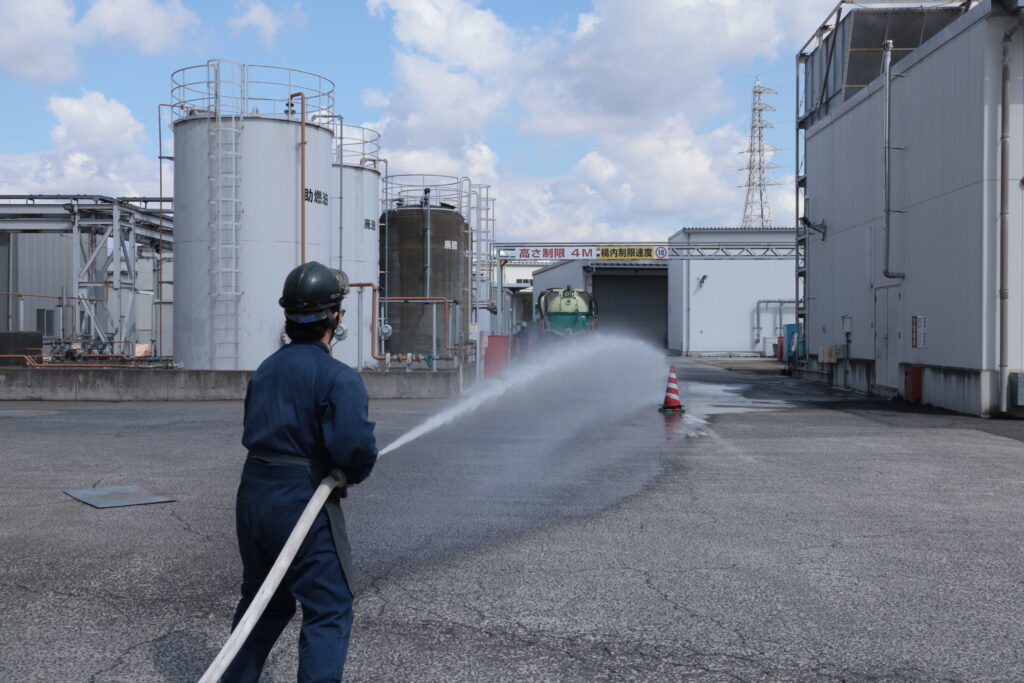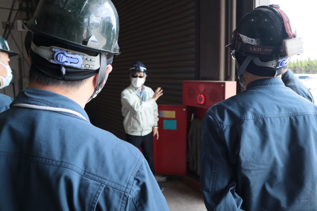 今回は、事務所隣のピットから出火したという想定のもと、現場と事務所が連携しながら、初期消火から避難まで一連の流れを確認しました。